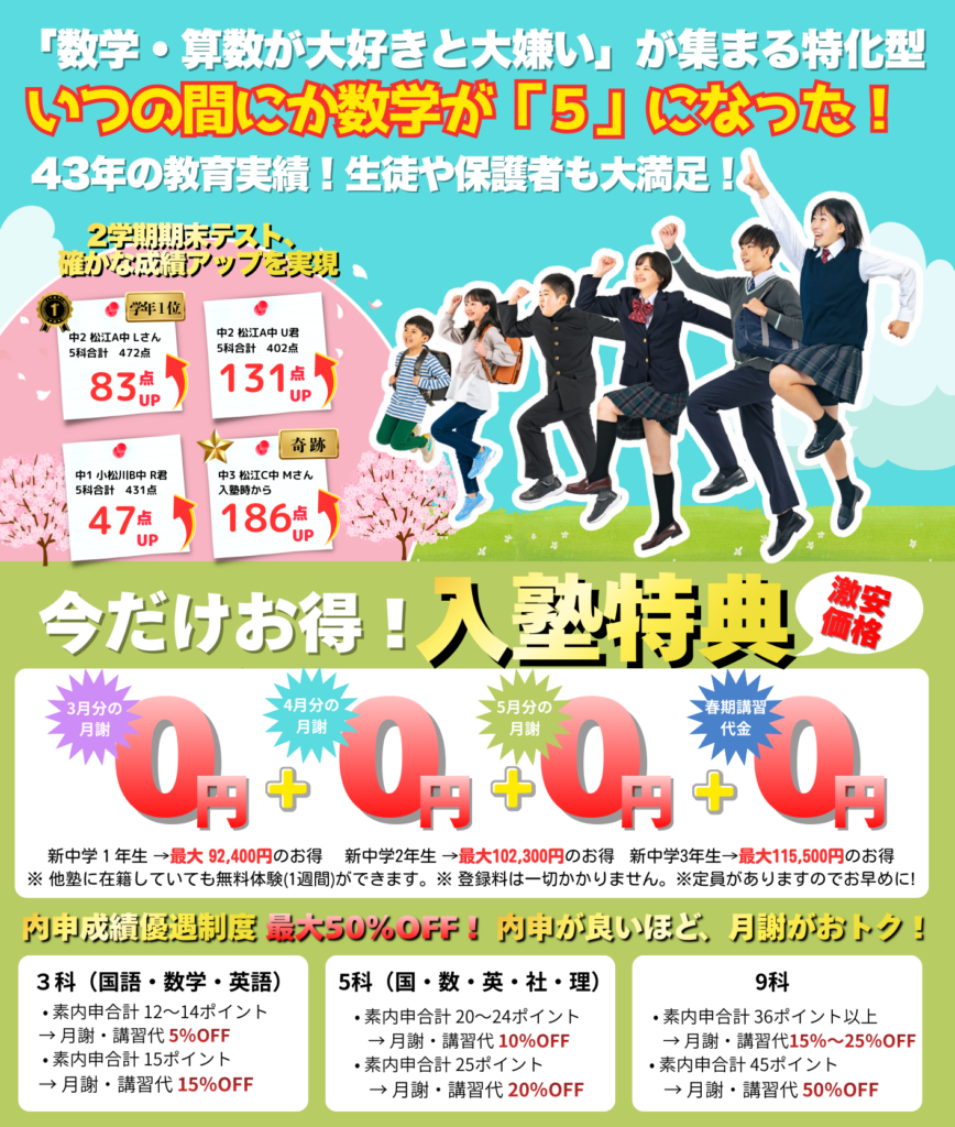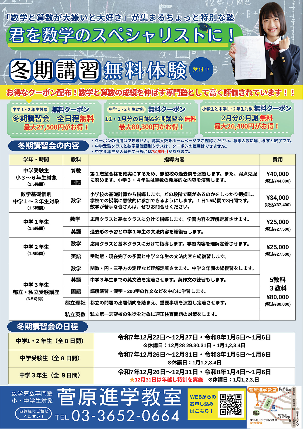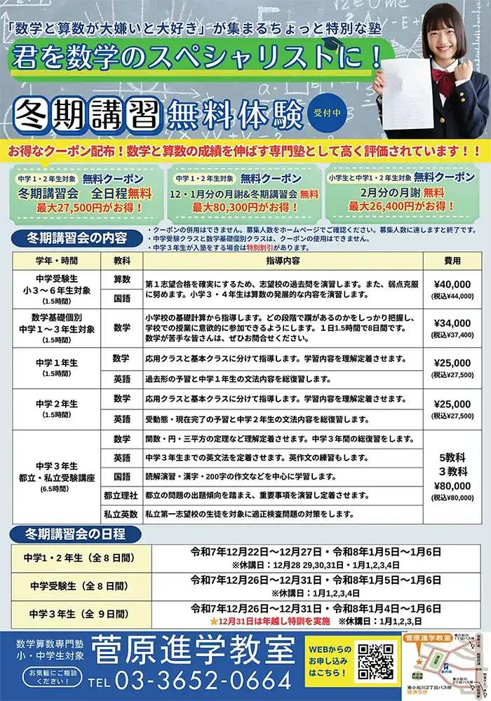 | 中学3年生 数学と英語は単科でも受講可能 冬期講習は5科全て5名以内の指導です |