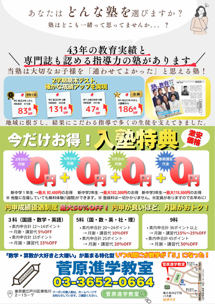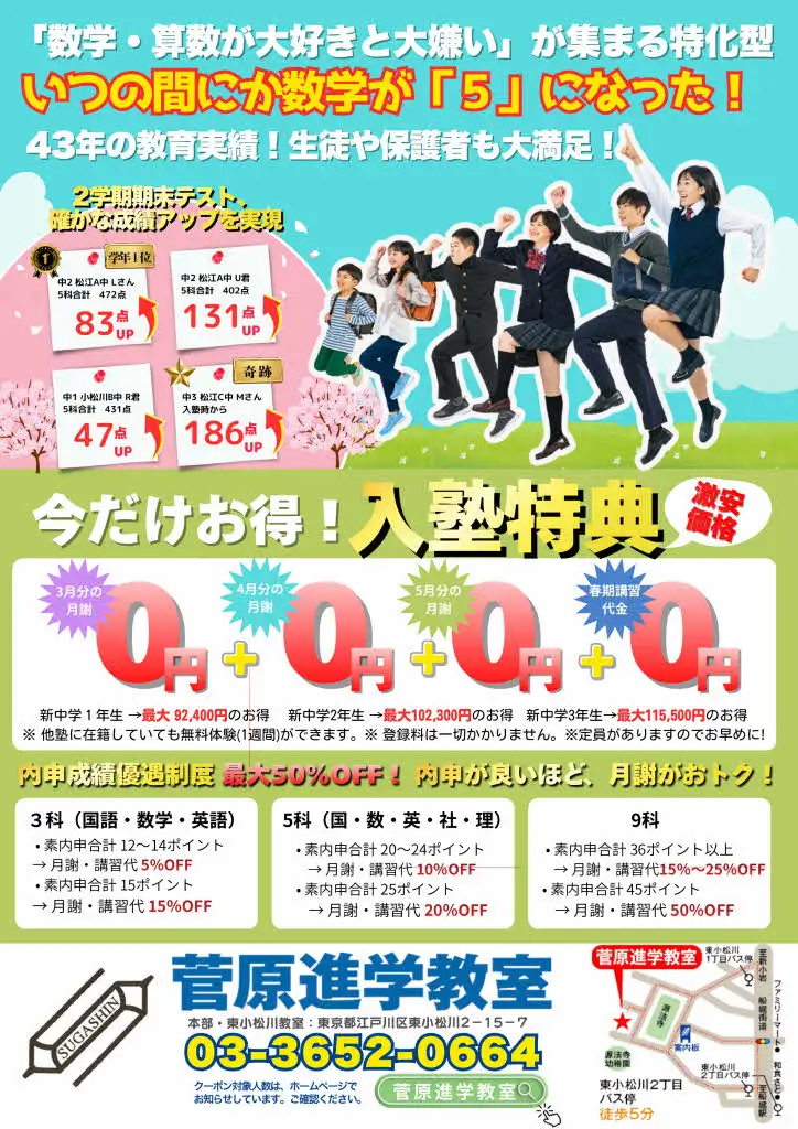 ▼私立高校実績 市川、東邦大東邦、豊島岡女子、中央大学、本郷、法政第二、昭和学院秀英、法政大学、明治学院、日大習志野、江戸川女子Ⅲ類、創価、成城、國學院、芝浦工大、足立学園、東京電機大学、十文字、千葉日大第一、日大桜丘、専修大学、日大豊山女子(理数)、日大第一、日大豊山、関東国際(文理・英)、城西大附属城西、東海大高輪、東海大浦安、千葉商科大付属、京華、岩倉、正則 ▼私立高校実績 特待・特進 朋友学院(国公立)、安田学園(S特)、日大鶴ヶ丘(特進)、東洋(特選)、二松学舎(特進)、関東第一(特進)、共栄学園(特進)…その他多数 |