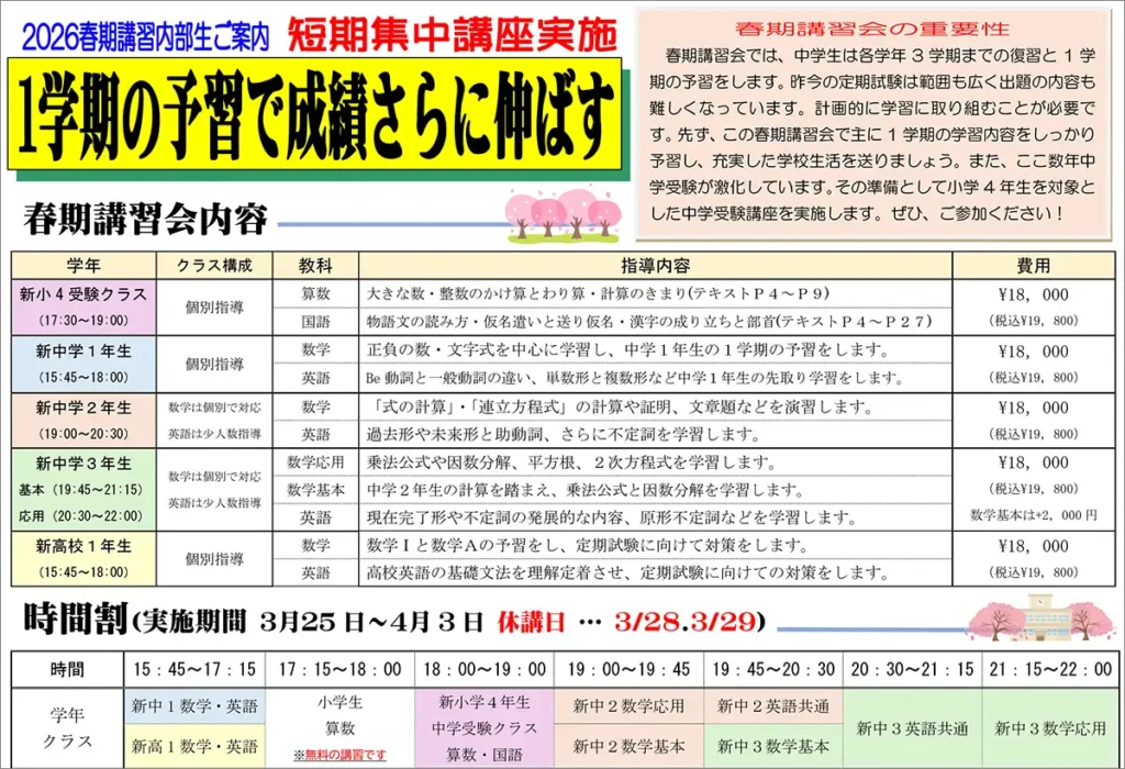 当塾では 2026年春期講習会(短期集中講座) を実施します。
